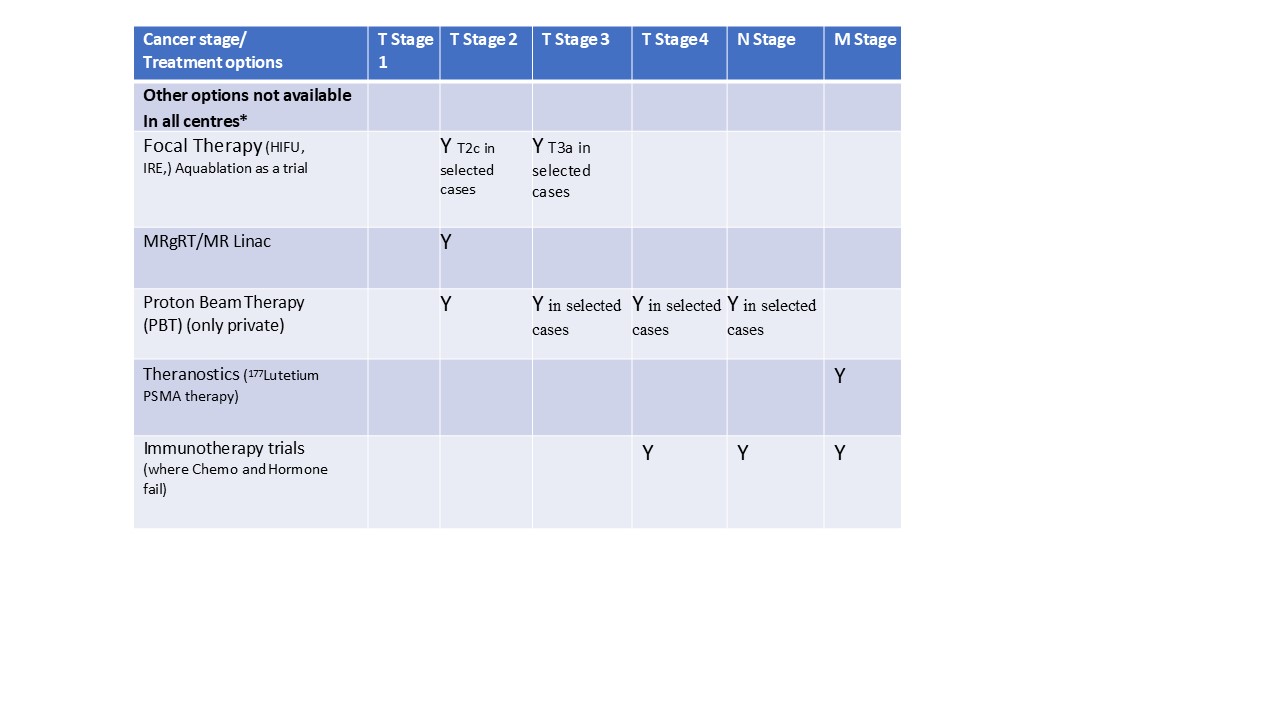 *Focal therapy. HIFU =prostates up to 40cc and Posterior tumours, Cryotherapy =Anterior tumours. Nanoknife is also an option. NOTE Focal treatment can be used for stage T2a and T2b cancers as well as T2c is some cases and T3a in some cases. Focal therapy can also be used for salvage therapy for local recurrent cancer up to T2c if radiotherapy (IMRT) fails. Focal therapy treatments are currently only available at a few centres. Note by Mr Taimur Shah