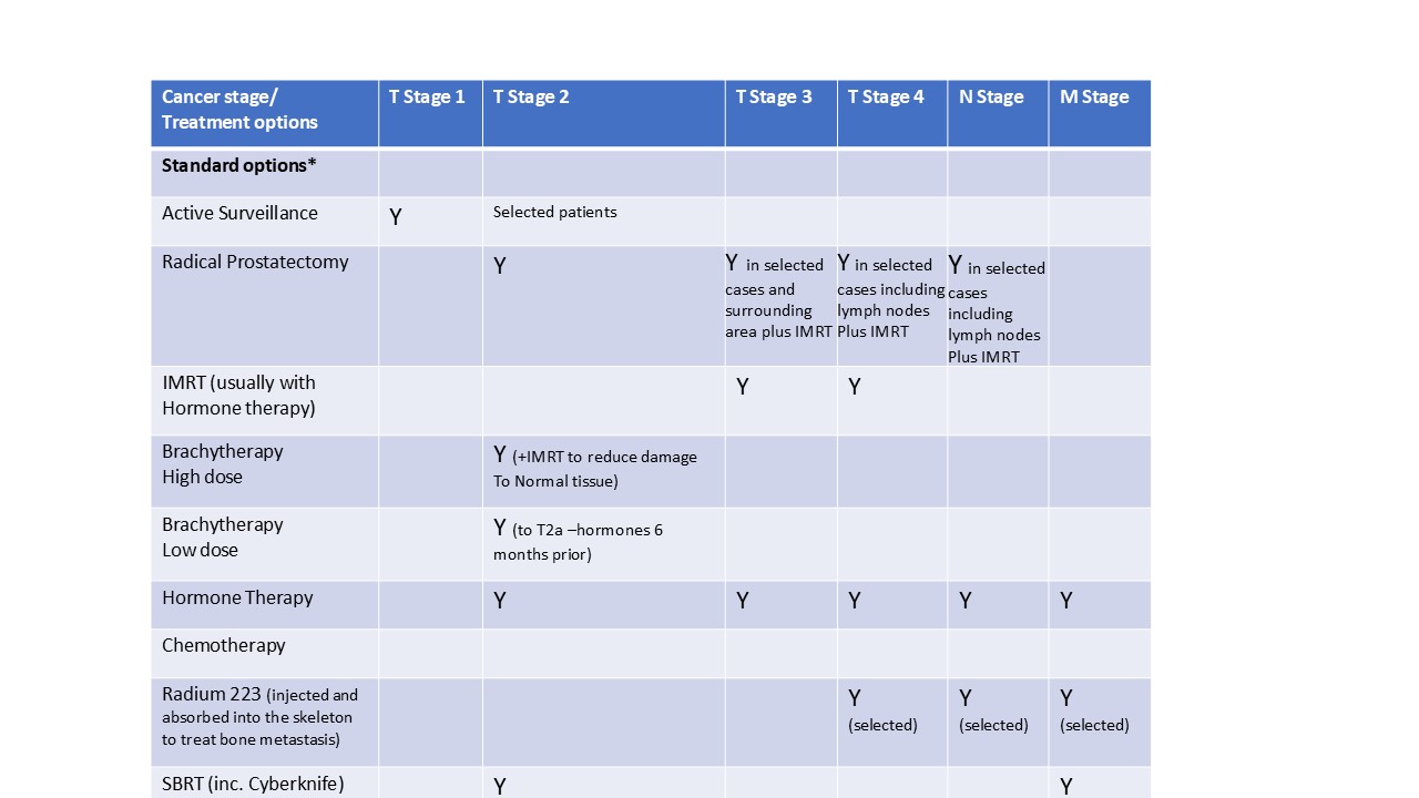It is suggested you read about the Gleason score and staging the severity of the cancer before studying this page. There are pages on the site describing each of the treatments and where to access them.